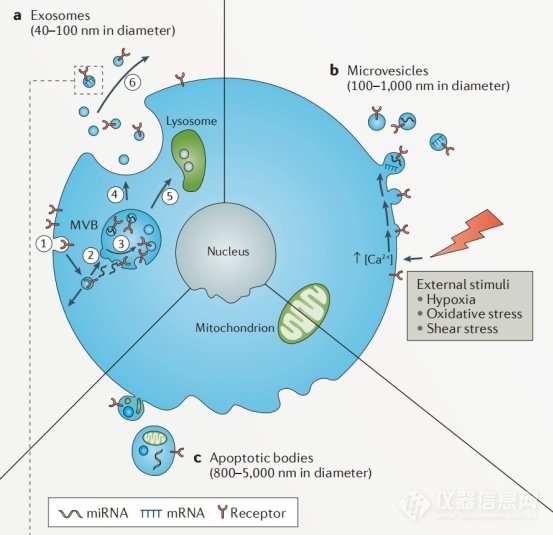 胞外囊泡主要由微囊泡(Microvesicles, MVs)和外泌体(Exosomes, Exs)组成,微囊泡是细胞激活、损伤或凋亡后从细胞膜脱落的小囊泡,直径约为100nm – 1000nm。外泌体(exosome)是一种由细胞释放到细胞外基质的膜性小囊泡,直径约为40-100nm(有说30-150nm,目前尚无定论),广泛存在于细胞培养上清以及各种体液(血液、淋巴液、唾液、尿液、精液、乳汁)中,携带有细胞来源相关的多种蛋白质、脂类、DNA、mRNA、miRNA等,参与细胞间通讯、细胞迁移、血管新生和免疫调节等过程。在糖尿病、心血管疾病、艾滋病、慢性炎症疾病以及癌症中都发现细胞外囊泡水平的升高,它们很有可能成为这类疾病的诊断标志物。